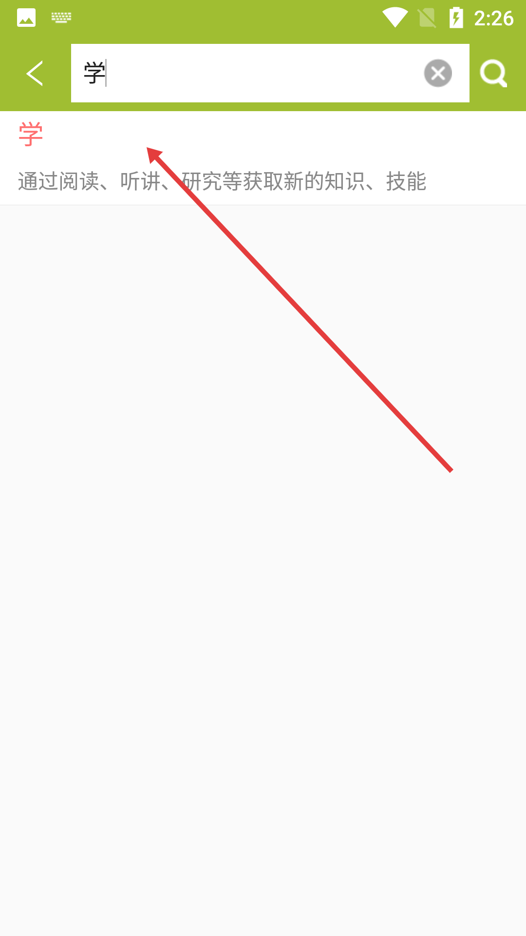 1、打開《小學(xué)生字典》,點(diǎn)擊搜索框,輸入要查詢的關(guān)鍵詞(如“學(xué)”)。