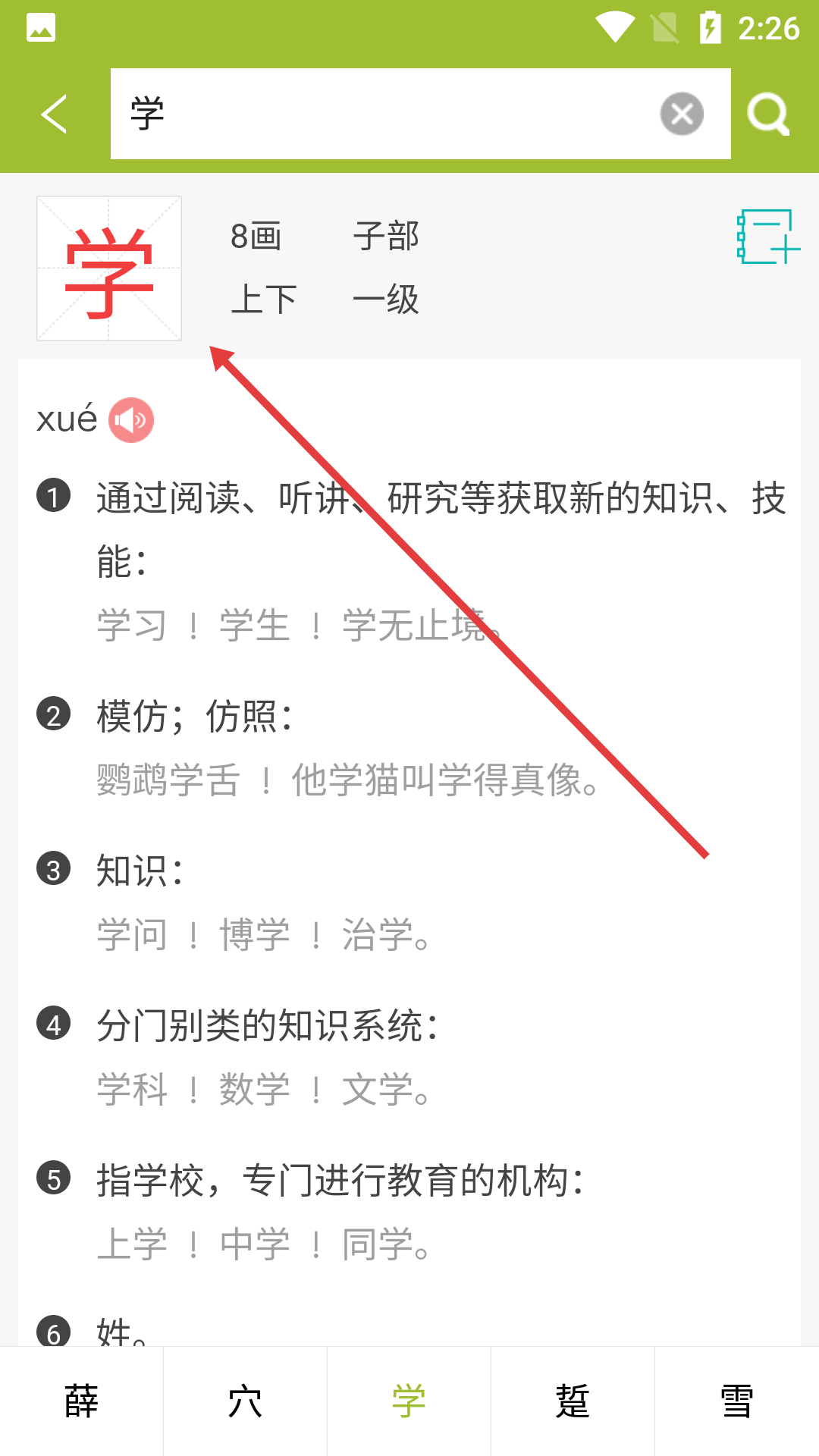 3、在詳情頁可查看漢字的筆畫數(shù)、部首、結(jié)構(gòu)、拼音及多重釋義(如“學(xué)”有“學(xué)習(xí)”“模仿”等含義)。