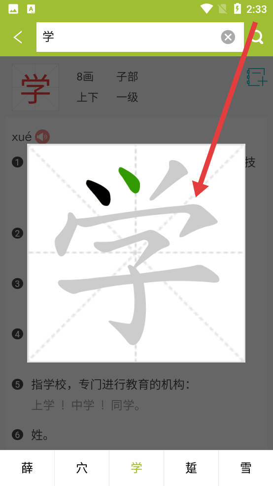 2、在搜索結(jié)果中,點(diǎn)擊目標(biāo)漢字(如“學(xué)”),進(jìn)入該字的詳情頁面。