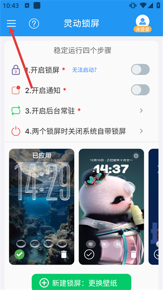 1、在【靈動鎖屏】主界面,先完成穩(wěn)定運行的四個步驟配置,再點擊【新建鎖屏:更換壁紙】按鈕可設置個性化鎖屏。