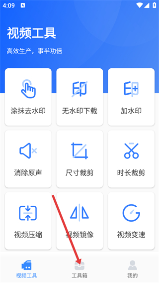 2、在視頻工具頁面點(diǎn)擊底部的【工具箱】選項(xiàng),可進(jìn)入工具箱功能頁面。