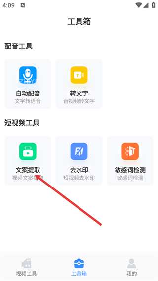 3、在工具箱的短視頻工具板塊中,點(diǎn)擊【文案提取】選項(xiàng)進(jìn)入對(duì)應(yīng)功能頁。