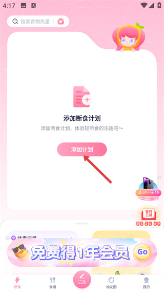 1、在斷食板塊界面中,點擊【添加計劃】按鈕來創(chuàng)建斷食計劃,以此體驗輕斷食的相關(guān)功能與樂趣。