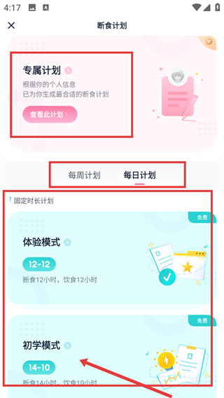 2、進入斷食計劃頁面后,可選擇【專屬計劃】或按時間周期計劃分類下的模式,對照個人需求來選定計劃。