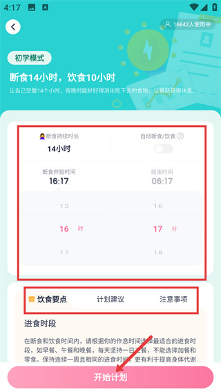 3、選定【初學(xué)模式】后,可設(shè)置斷食的起止時間,查看【飲食要點】等內(nèi)容,確認信息后點擊【開始計劃】啟動斷食。