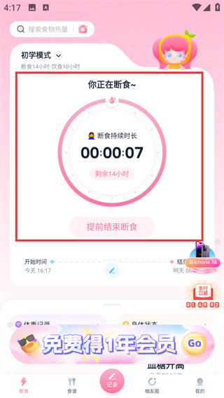 4、啟動計劃后將進入斷食計時界面,顯示【斷食持續(xù)時長】及剩余時間,也可通過【提前結(jié)束斷食】按鈕終止計劃。