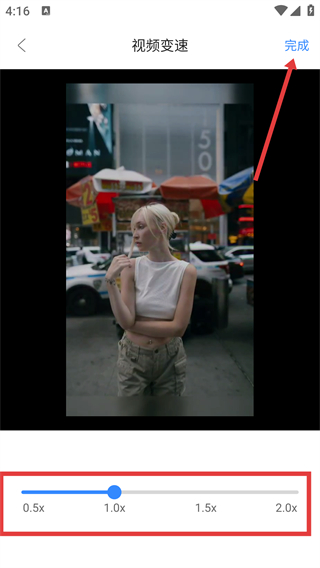 3、在【視頻變速】頁(yè)面拖動(dòng)調(diào)節(jié)條選擇速度(范圍0.5x-2.0x),設(shè)置后點(diǎn)擊右上角【完成】。
