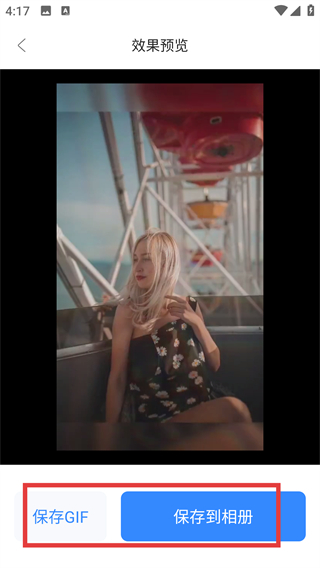 4、進(jìn)入效果預(yù)覽頁(yè)面后,可選擇【保存GIF】或【保存到相冊(cè)】,完成處理后視頻的存儲(chǔ)。