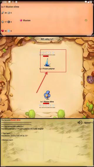 2、在Rift-valley-Lv1場(chǎng)景,操控角色與【Lv1-Frozen-polymer】戰(zhàn)斗,注意角色和敵人的屬性與狀態(tài)。