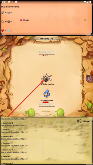 3、到Rift-valley-Lv2,與【Lv2-Tinning-machine】對(duì)戰(zhàn),利用角色技能和策略,爭取勝利提升等級(jí)。