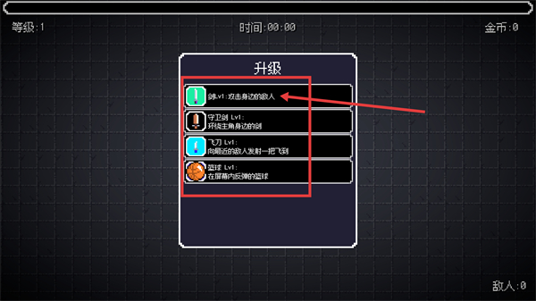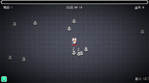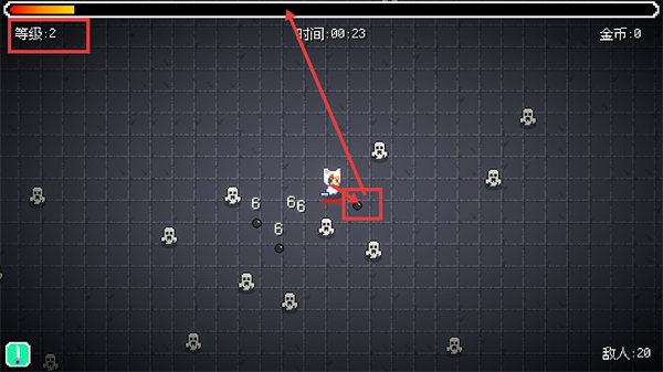 4、升級至【等級:2】后,拾取場景中的掉落道具,提升輸出效率以應(yīng)對數(shù)量更多的敵人。